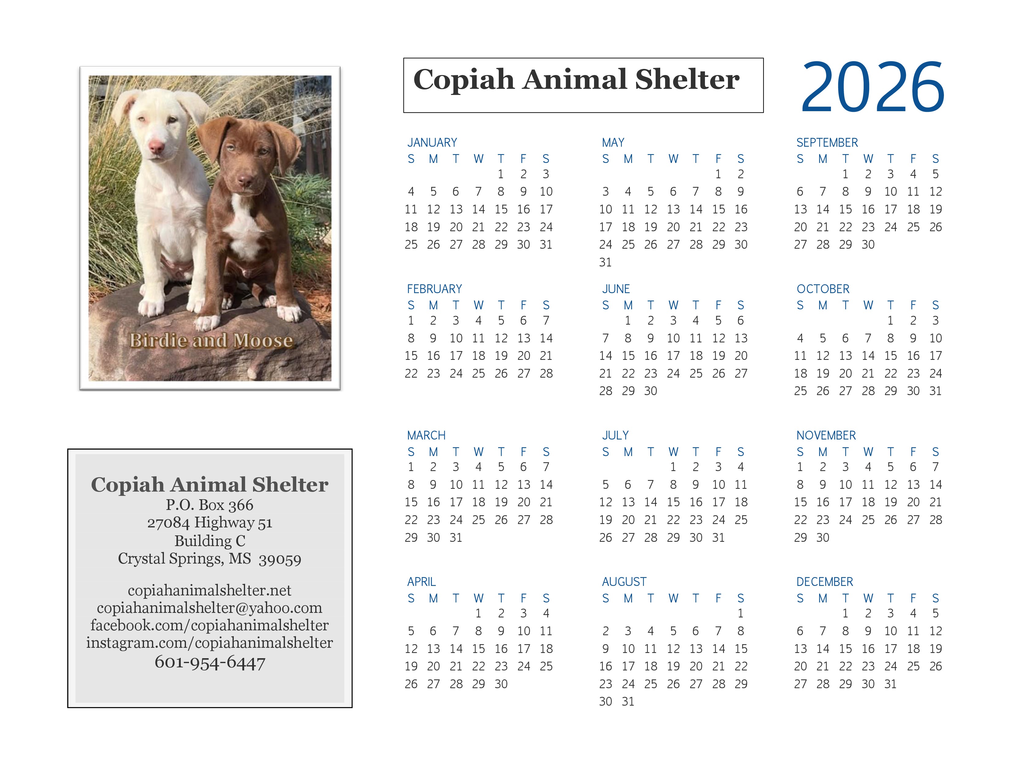 Print and display and share CAS 1-page 2026 Calendar below. Featuring adorable puppies Birdie and Moose who are already adopted into their new homes! JPG and PDF downloadable files below.